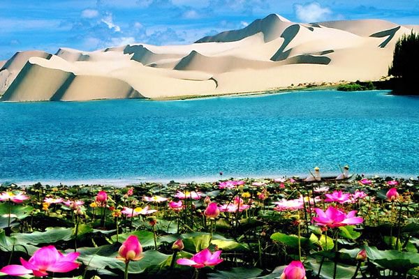 Đồi cát trắng (bàu trắng): Đồi cát này tuy cách xa Mũi Né hơn 25km, nhưng bạn đừng bỏ qua trong dịp nghỉ lễ này nhé, vì đây mới chính là thiên đường của cát đấy bạn ạ. Ở đây, giữa không gian mênh mông của cát trắng, bạn còn đường chiêm ngưỡng những cánh sen hồng nở trong đầm sen giữa mênh mông cát đấy. Còn gì tuyệt hơn phải không nào.